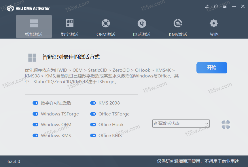 智能激活:点击“橘黄色按钮”,将激活Windows和Office,智能识别最佳的激活方式(优先顺序依次为数字许可证/KMS38/OEM[注]/KMS)。如果识别到Windows或Office已经永久激活,则自动跳过。
