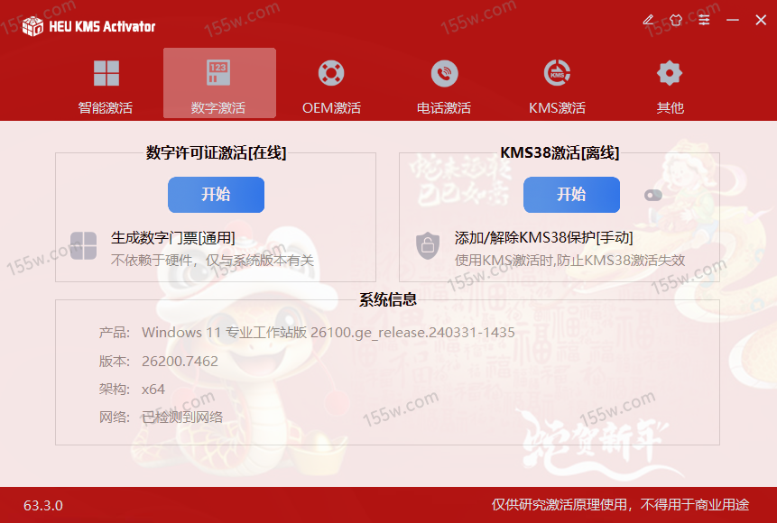 • 查看当前系统信息:网络状态/激活状态,描述便于快速查看是否支持数字许可证/KMS38