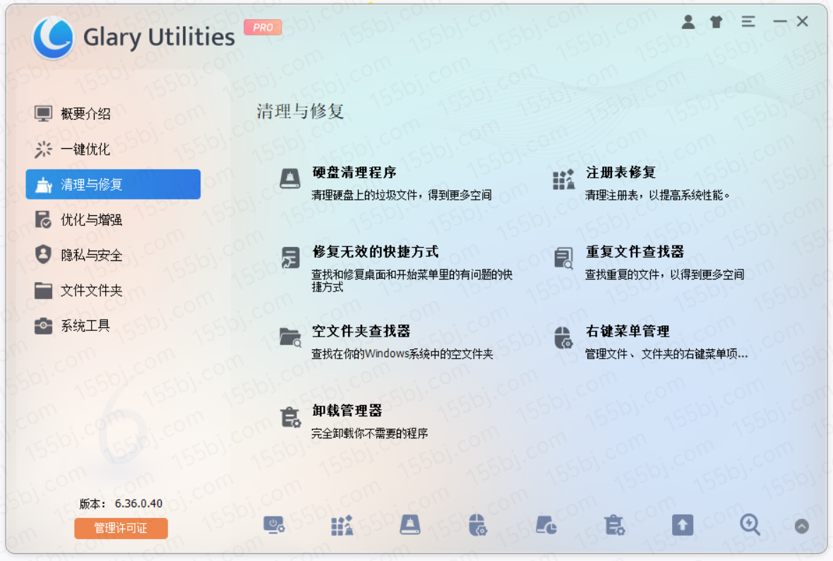 Glary Utilities Pro 是一款国外老牌的全能系统优化工具,Glary Utilities 一站式电脑优化解决方案。它允许你清理系统垃圾文件,无效的注册表键值,上网记录,管理和删除IE插件,分析磁盘空间使用情况,查找重复文件,优化内存,查找、修理或删除快捷方式,管理 Windows 启动程序,卸载软件,安全删除文件,查找空目录,右键菜单管理,包括超过20 +系统实用程序来提高你的计算机的性能。支持简体中文等多语系界面。