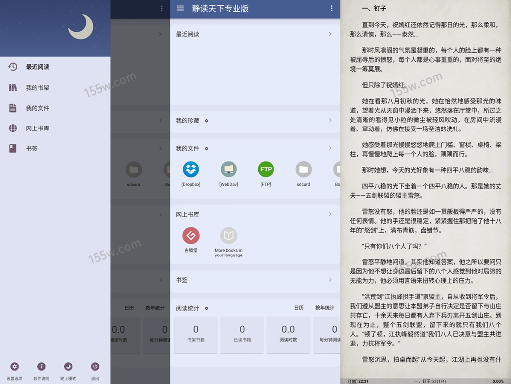 静读天下,Google Play 应用商店排名第一的阅读器,支持在线书库和本地阅读,文字转语音,支持多个在线书库, 内容丰富全面,已加入书库包括书仓, HIFIWIKI 中文书站, 古腾堡等, 并在持续增加中,给你仿真阅读体验。